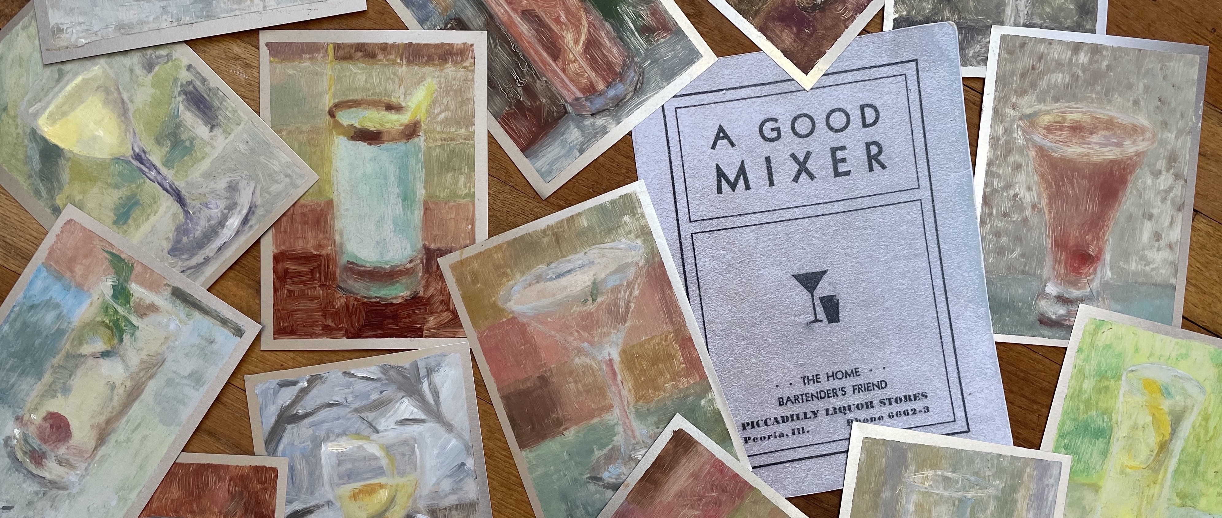 Five of the cocktail personae are available as limited-edition broadsides, depicting the character’s cocktail painting, flanked by the two poems representing their inward and outward expressions, with the drink recipe appearing along the border. Swipe through the gallery below for samples of each. The five characers available include: